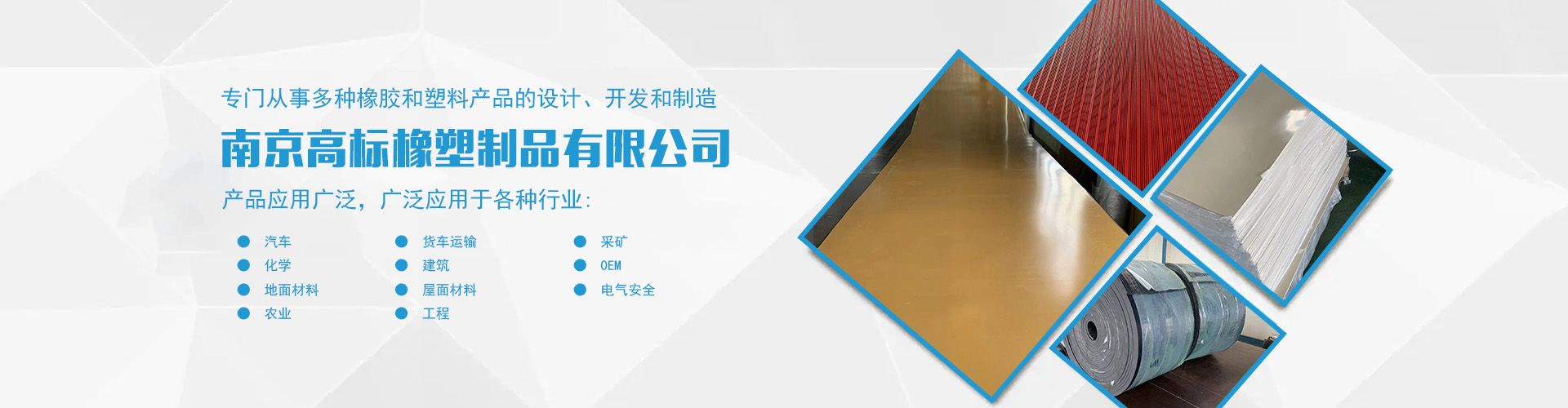 南京高標橡塑制品有限公司是一家專業(yè)的橡膠板、橡膠制品和熱塑性塑料產(chǎn)品的制造商。主營產(chǎn)品:三元乙丙橡膠板,丁腈橡膠版,氯丁橡膠板,丁苯橡膠板,丁基橡膠板,天然橡膠板,硅橡膠板,氟橡膠板,絕緣,防靜電,導電橡膠板,夾布,夾金屬網(wǎng)橡膠板,耐酸堿橡膠板,耐油橡膠板,耐磨橡膠板,阻燃橡膠板,阻尼橡膠板,減震橡膠板,防滑橡膠板,橡膠墊片等。 高標橡塑專門從事多種橡膠和塑料產(chǎn)品的設計、開發(fā)和制造。我們的產(chǎn)品應用廣泛。廣泛應用于各種行業(yè),包括:汽車,貨車運輸,采礦,化學,建筑,OEM,地面材料,屋面材料,電氣安全,農(nóng)業(yè),工程等。 高標橡塑的客戶服務于許多行業(yè),包括墊片切割、分銷商、工業(yè)用品零售商和批發(fā)商。自